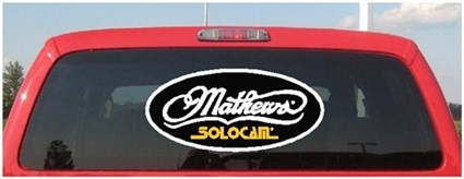This is a full color Mathews Archery oval decal white outline, White Mathews & Gold Solocam. This decal is avaialbe 3 three sizes and really pops on tinted glass. Shown here against a Black background to simlulate tinted windows. This is the decal for you if you shoot a Mathews bow, slap one on your hunting rig today!