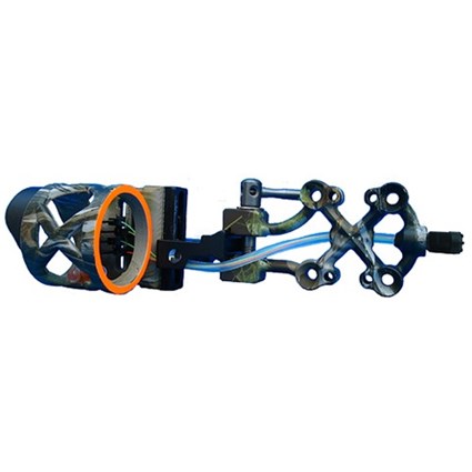 Direct mount sight that features 4 pins in .019" fiber, 1 5/8" diameter housing with level and a machined in sun shade, tool less adjustments for windage and elevation that are laser engraved and comes with a purple haze light. Right hand. Lost Camo.